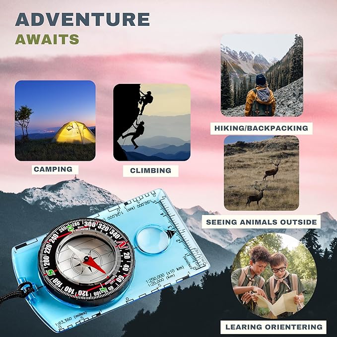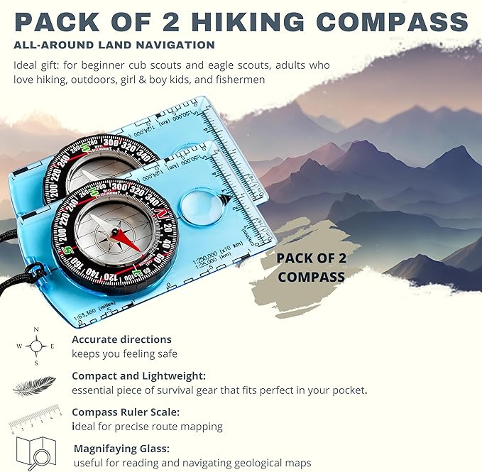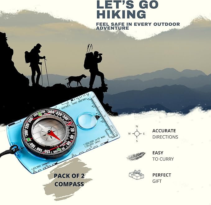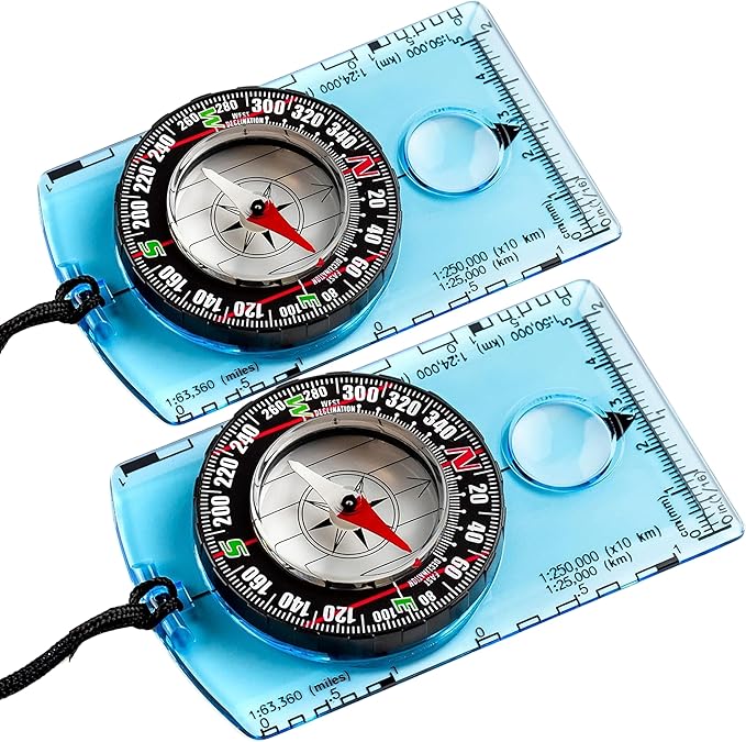 - IMPRESSIVE FEATURES: Both Compasses come with a non-magnetic Acrylic Baseplate to not intwith the magnetic needle, and have the best accuracy. The needle is placed in a bubble that allow the needle to have a quick 360 degrees rotation helping us to have a accurate and fast reading of the direccion the we have to take. Its differents Ruler Scales help the hiker to read the map more accurate. It also has a Magnifying Glass that help us to read geological maps and small details of the map.