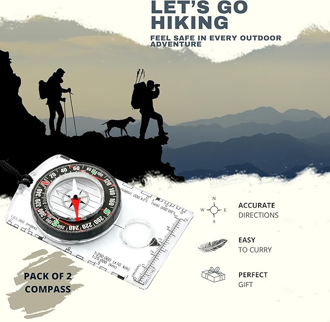 - IMPRESSIVE FEATURES: Both Compasses come with a non-magnetic Acrylic Baseplate to not intwith the magnetic needle, and have the best accuracy. The needle is placed in a bubble that allow the needle to have a quick 360 degrees rotation helping us to have a accurate and fast reading of the direccion the we have to take. Its differents Ruler Scales help the hiker to read the map more accurate. It also has a Magnifying Glass that help us to read geological maps and small details of the map.
