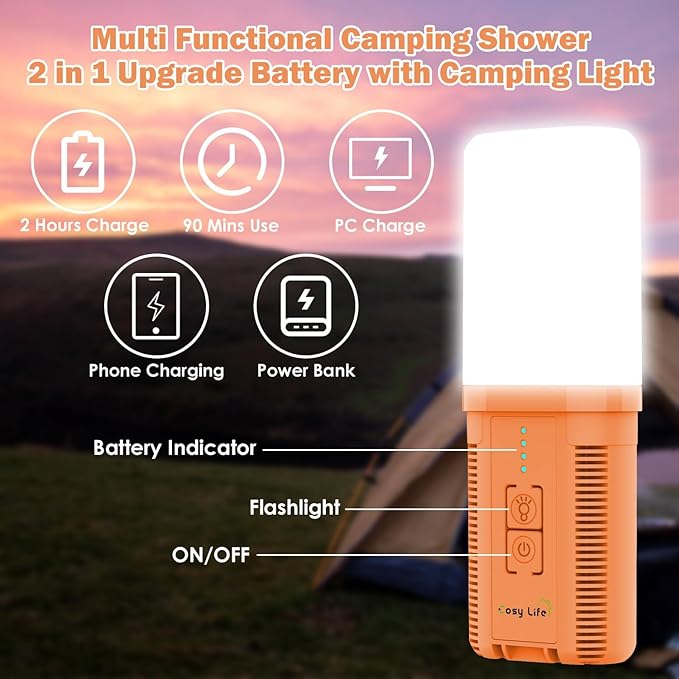 - Type-C Rechargeable with Indicator & Camping Light: Cosy Life portable shower has split type 4400 mAh battery and lasts up to 100 minutes after fully charged. The 4 indicators on the battery shows the battery level, no worry about low battery. The practical LED light has SOS mode - "flash" and emergency light mode - "Keep ON", making your outdoor adventures more convenient and safer