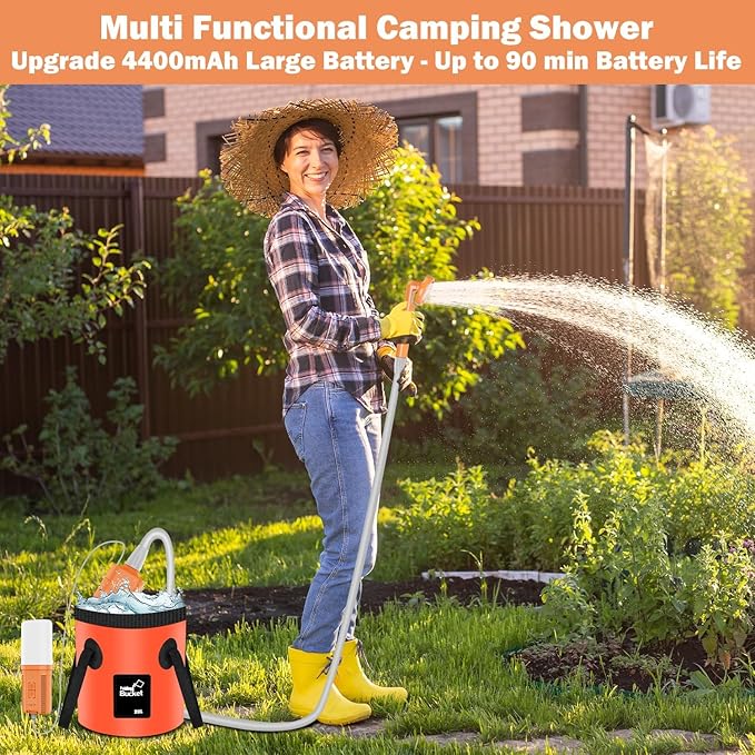 - Portable Shower for Outdoor: This portable shower pump kit with water bucket have a wide range of use, it isn't just for camping, but also great for watering plants, cleaning the backyard, and even as a portable dog shower, a great gift for family and friend. If you encounter any problem during use of the camping shower pump, please contact us, we’ll give you a satisfactory solution soon