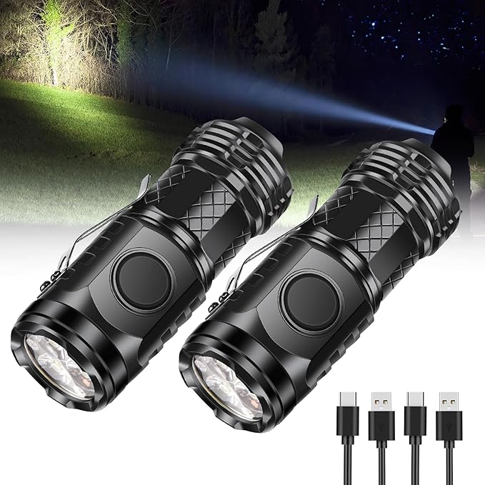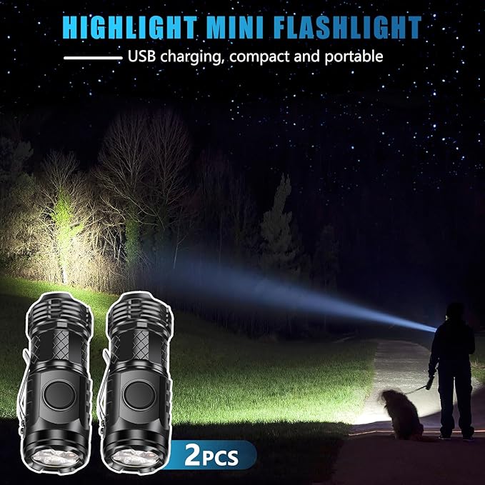 2 Pcs Mini Flashlight Rechargeable, Pocket Flashlight Super Bright 5 Modes, Powerful Mini Flashlight Portable Small LED Flashlight for Camping Outdoor