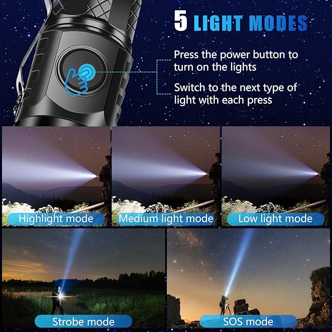 - 【5 Modes】The small flashlight has 5 lighting modes: High/Medium/Low/Strobe/SOS, you can switch modes according to the needs of the scene. Our flashlights have a longer range and stronger light, And Is More Suitable For Activities Such As Field Searching and Patrolling.