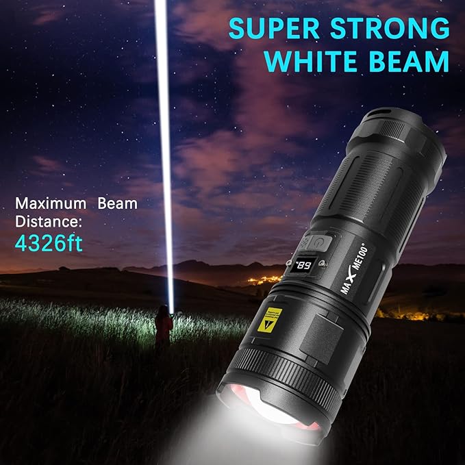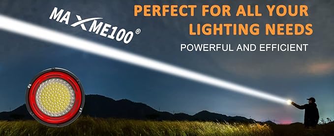 - [Powerful And Efficient]: Utilizing advanced white beam technology, this MAXME100 high lumen flashlight is engineered to deliver superior illumination that is both powerful and efficient. Designed to banish darkness, it illuminates with unparalleled brilliance, reaching far distances and providing optimal visibility in any situation. Say goodbye to dim, unreliable flashlights and embrace the professional-grade brightness of the MAXME100.