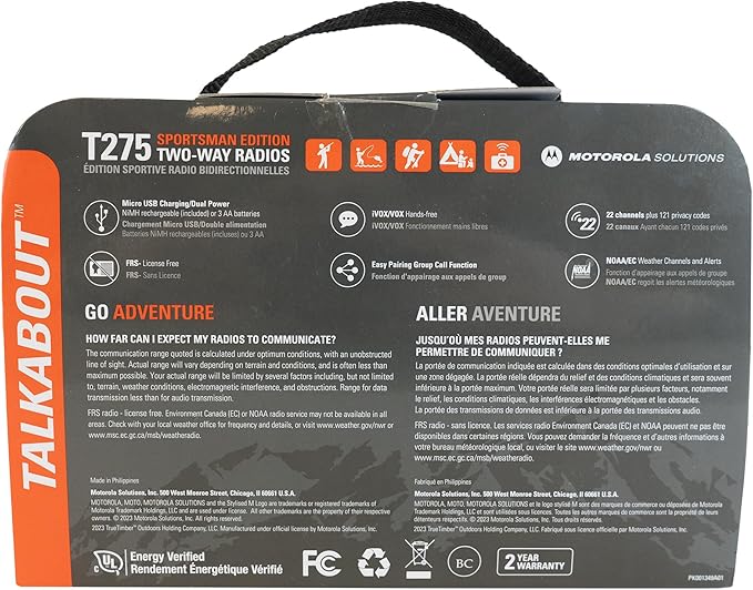 Motorola Solutions, Portable FRS, T275, Talkabout, Two-Way Radios, Rechargeable, 22 Channel, 25 Miles, Orange W/Black, 2 Pack