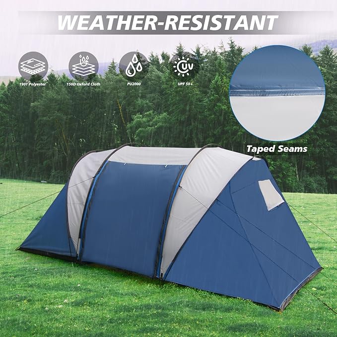- Weatherproof & Waterproof: Equipped with sturdy 190T polyester fabric, PU2000mm of superior waterproofing, fully taped sealed seams to ensure a dry and comfortable environment for your family. The included front porch provides extra water and weather protection. Sturdy fiberglass poles ensure stability for a long-lasting camping experience.