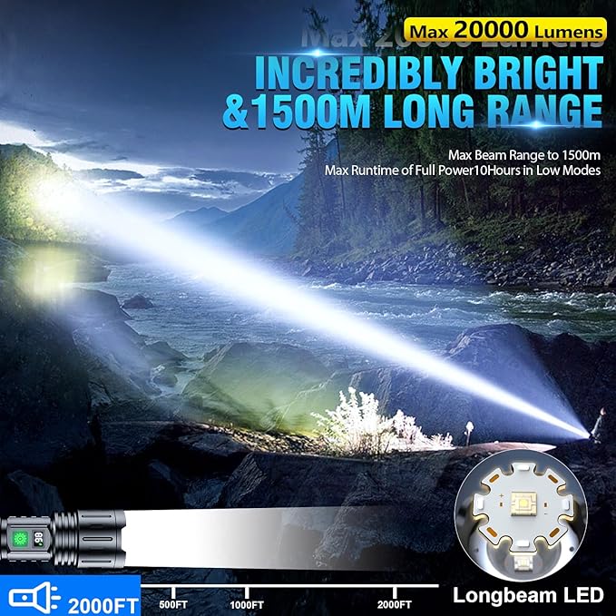 - Super Bright Long Beam Flashlight: Try our Hoxida rechargeable 20000 high lumen flashlight, with an optical-grade double-convex lens that produces a perfectly balanced beam, This Powerful LED Flashlight REAL illumination distance can be reach up to 1500ft, light is more wider and brighter than ordinary LED flashlight.easily easily lock the target and lighting up an entire room or backyard.Especially suitable for special needs such as field search, sea rescue, long-distance instructions, etc.