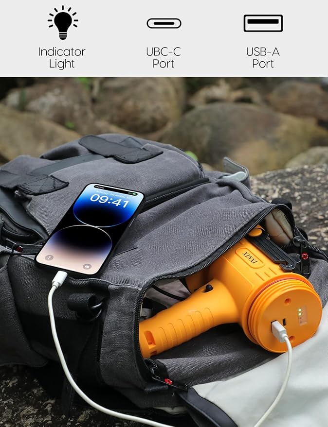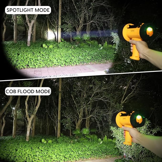 - RECHARGEABLE BATTEREIS & POWER BANK : The spot lights outdoor handheld Built in a 10,000mAh batteries. Complete quick charging in 4hours with a 2A adapter (NOT included in the package) and the included USB cable. Universal USC charging port can even be used as a power bank to charge other devices.