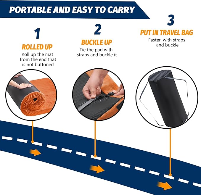 - 【EASY PORTABLE & WATERPROOF AND NON-SLIP BOTTOM】Free storage bag and packing straps are included. The adjustable buckle design on the fleece cover can help the portable mattress for adults to be easily rolled up and folded into the accompanying travel bag as camping gear, which saves space and is easy to carry. The non-slip waterproof fabric design on the bottom of the car camping mattress can adapt to various complex terrains from camping tent, such as slippery ground, stones, tree roots, etc.