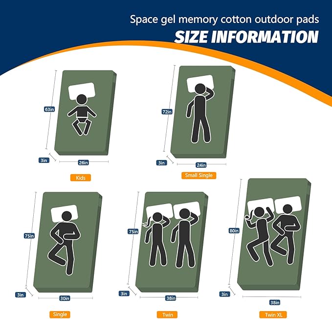 - 【MULTI-SIZE OPTIONAL & AFTER-SALES SERVICE WITHIN 24 HOURS】 5 sizes for you to choose from camping mattress full size, kids (63x26x3") small single (72x24x3”) single (75x30x3”) twin (75x38x3”) twin xl size (80x38x3”), Be sure to choose the most suitable size. Since we shipped by vacuum compression packaging, please Open the package and place it for about 24-48hours. If you have any question, feel free to contact us. Please believe that we will solve the problem for you within 24 hours.