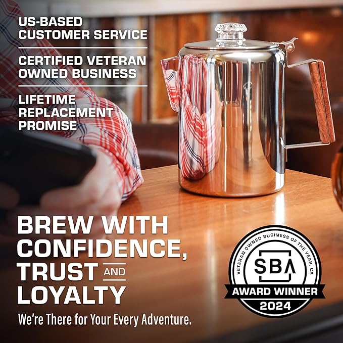 - LIFETIME REPLACEMENT GUARANTEE — Top materials & workmanship to deliver a premium guarantee to replace your percolator when damaged. Shop with confidence. This is the last camping percolator coffee pot you will ever need. US-based customer service available on weekdays. COLETTI is committed to every camper’s adventure, and we’re here to help you brew great coffee anywhere and everywhere you may be. So this summer, choose to brew with a good ol’ brand that you can trust. Brew Every Summer with COLETTI