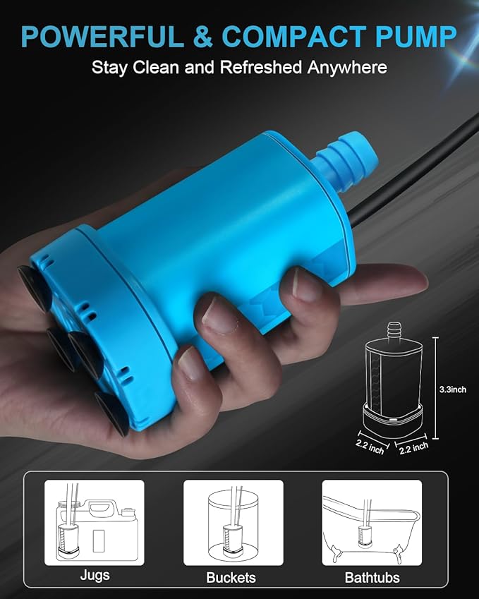 - COMPACT & PORTABLE --- Shower pump only 2.2*2.2*3.3 inches, makes it easily fit most jugs mouth. The shower's bottom suction design with four suction feet, which can be hold the bottom of the water bucket firmly.