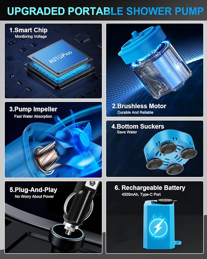 - SAFE & RELIABLE --- With Exclusive brushless motor, combined with smart chip that monitoring voltage, current, and temperature to keep shower pump running for more safety,long life. The AUTOPkio camping shower is the ideal rinse kit for all your off-grid adventures.
