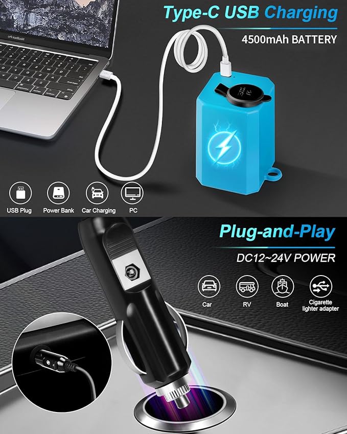 - MULTI-FUNCTIONAL PORTABLE SHOWER --- No more compromising. We offer two ways shower to get power, either with a removable battery that shower pump can work for up to 90-120 minutes with a full charge, or plugging into the cigarette lighter to get a constant power.