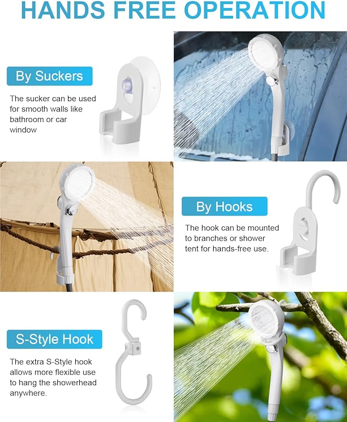 - WHAT'S IN THE BOX -- Shower pump,Adjustable shower head, Spray, USB-C cable, 4x bottom suckers, Food-grade silicone hose, 1x 5m Adapter cord, 2x Rubber rings (one is originally installed on the hose, the other is for replacement), 1x Showerhead holder, 1x Hook for shower holder, 1x S-shape hook, 1x Storage bag, 1x User manual