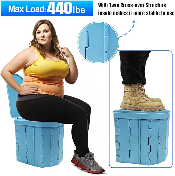 - Stability and Durability: This camping portable toilet is made of high quality ABS plastic and unique folded design, load capacity up to 440 Lbs, easy to set up, folds up in seconds and can easily fit in a backpack or car trunk. Toilet size: 13x11x12inches (LxWxH) (folded height: 2.8inch), product weight: 3.5LB, the seat is a novel oval shape that will always meet your needs.