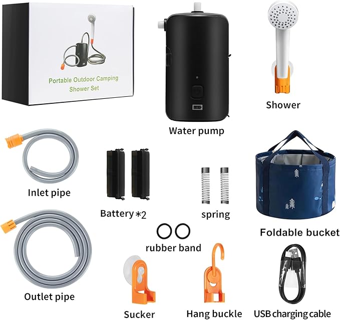 - 【Easy Installation and Operation】Connect tubes to shower pump and shower head, drop the suction pipe into the bucket of water, press the power switch to start the camping shower. It will pump water from bucket into a gentle, steady shower stream and you get a nice flowing shower. Take a shower after swimming in the sea, playing on the beach or when go out for camping.