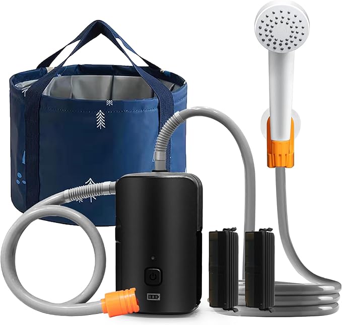 - 【Versatile Camping and Outdoor Use】 IPX6 waterproof, enough to handle short-time soaking and waterproof in daily use. Full battery life up to 80 minutes, to meet outdoor daily use of a family of 3-5 people. Intelligent design of two water flow stalls conversion button (Low stall 3L/Min; High stall 4L/Min) the perfect washing pressure. Portable Outdoor Camping Shower Applicable for outdoors, camping, pets cleaning, car washing, plants watering.