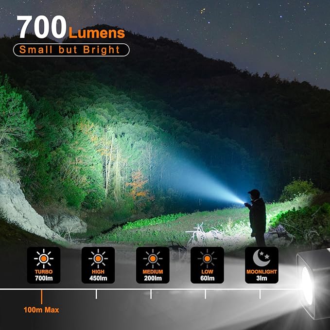- 𝗕𝗿𝗶𝗴𝗵𝘁 𝗮𝗻𝗱 𝗟𝗼𝗻𝗴 𝗟𝗶𝗴𝗵𝘁 -- One-key to switch 5 different modes, the highest lumen is 700lm, and the distance can reach 330ft, allowing you to spot dangers in the dark.