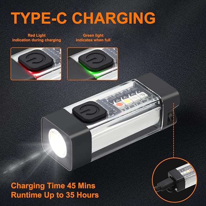 - 𝗨𝗹𝘁𝗿𝗮-𝗹𝗼𝗻𝗴 𝗕𝗮𝘁𝘁𝗲𝗿𝘆 𝗟𝗶𝗳𝗲 -- HUO JI keychain flashlights charging time is only 45 minutes and the lighting can last for up to 35 hours, so that you don't have to worry about sudden power outages when you are hiking or walking at night. It is also very suitable for pet owners who go out to walk their dogs at night.