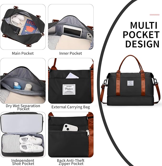 • Travel Bag with Shoe Compartment : The weekender bags for women travel is designed with shoes compartment at the bottom to separate your dirty shoes from the rest of your clothes
