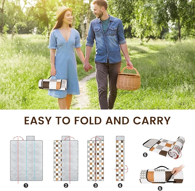 - 【Durable Three-Layer Design】 Designed with a 3-layer structure,our picnic blankets consist of a water-resistant 190T polyester fabric outer layer,a soft cotton-filled middle layer, and a thickened aluminum film bottom layer for excellent waterproofing. Enjoy improved comfort and durability during your outdoor picnics with our upgraded fabric technology!