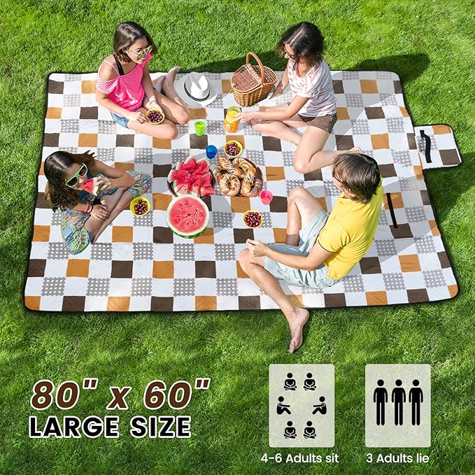 - 【80" x 80" Extra Large】The waterproof picnic blanket is an extra large outdoor blanket that measures 80" x 80" when unfolded.The picnic blankets waterproof foldable can allow 6-8 persons to sit on, or 4 persons to lie on. With its extra large size, the picnic mat is ideal for both family use and picnicking with several friends.
