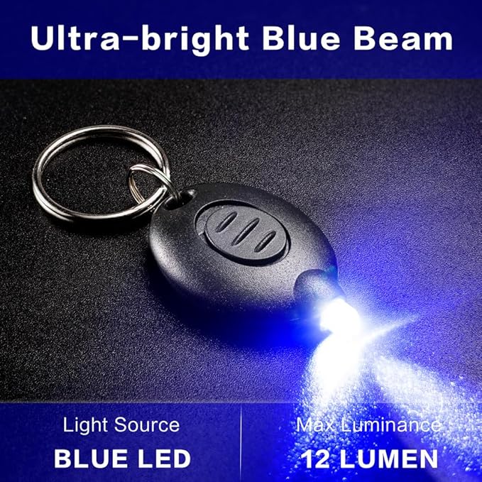 - Lightweight and Handy Keychain Blue Light: The size of the keychain blue LED flashlight is like a quarter, It's only 0.28OZ weight. It's very convenient to attach to the keychain, dog collar, zipper, backpack, hiking or camping devices and so on, it can be the easiest nearby emergency blue light to get.