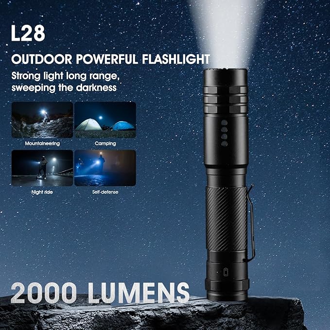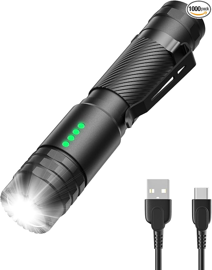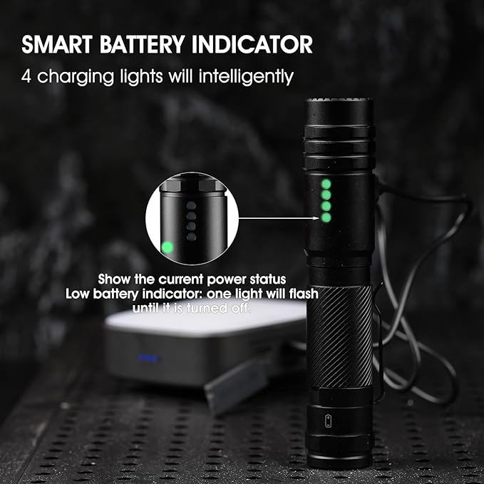 - 【Rechargeable USB-C】: This USB charging port flashlight can easily charge various USB devices. The included indicator light lets you know the charging status, and turns green when fully charged. In addition, the four indicator lights on the flashlight help to clearly understand the flashlight power (25%, 50%, 75%, 100%), ensuring that you clearly understand the battery status. The low-brightness mode can be used continuously for 30 hours, saving you the trouble of frequent charging.