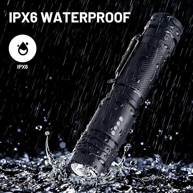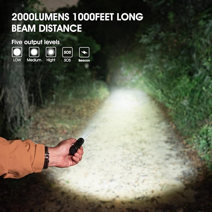 - 【5 Lighting Modes】: With 5 lighting modes (High/Medium/Low/Strobe/SOS), the pocket flashlight provides flexibility for any situation. Tail switch design allows for easy mode switching and has a memory function so you don't have to cycle through modes every time you turn it on. The 1000-foot floodlight easily illuminates the road at night.