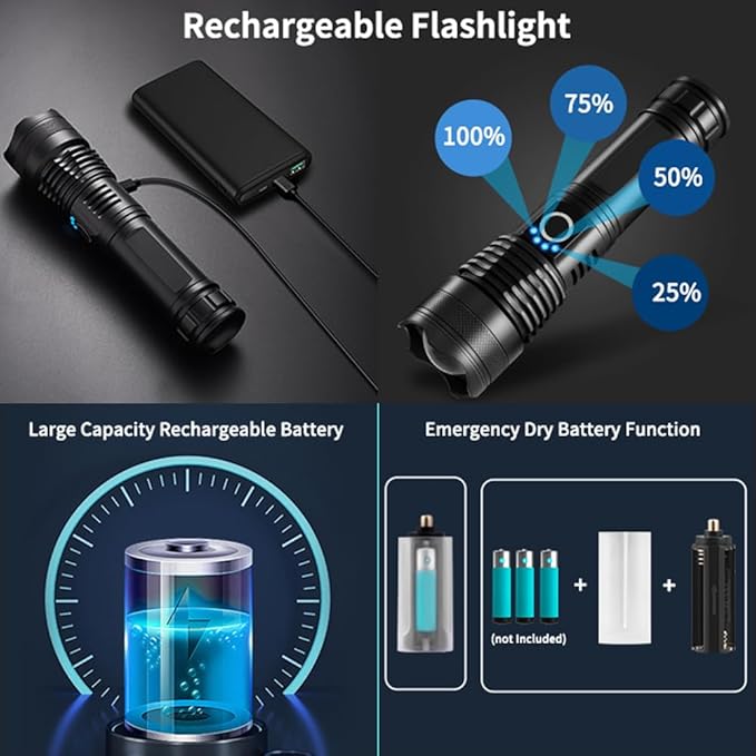 - Rechargeable & Power Display: With a large-capacity battery and a fast-charging Type-C interface, the rechargeable flashlight can be fully charged efficiently and work for 48 hours in different lighting modes. In addition, four power indicators can clearly show the battery level of the rechargeable flashlight.