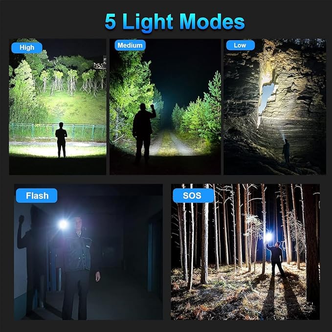 - Adjustable Focus & 5 Working Modes: Adjusting the focal length of the flashlight can change the size of the beam, so that you can switch the long-distance observation function and wide-range lighting function. The flash light is set up with 5 working modes - High / Medium / Low / Strobe / SOS, whic can be used to different occasions.
