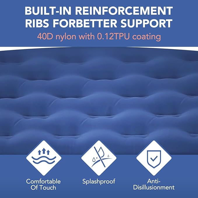 - 【40D nylon polyester & multi-layer TPU】:This camping bed mat is made of ultra-tough 40D nylon and inner waterproof TPU sealing coating, keeping you warm off the ground and keeping you from lying on the cold or rocky ground. the soft and cozy flocked top with a nice touch, keeping quiet when rolled over no squeaking for a comfortable night's sleep under the stars.