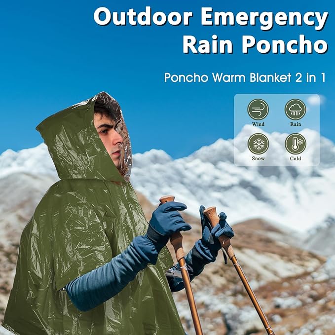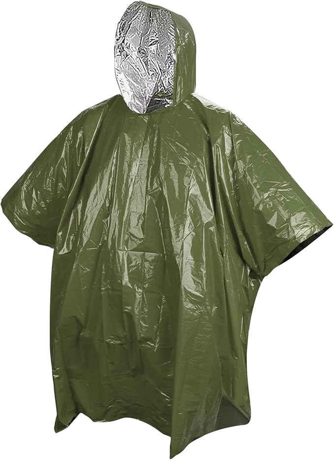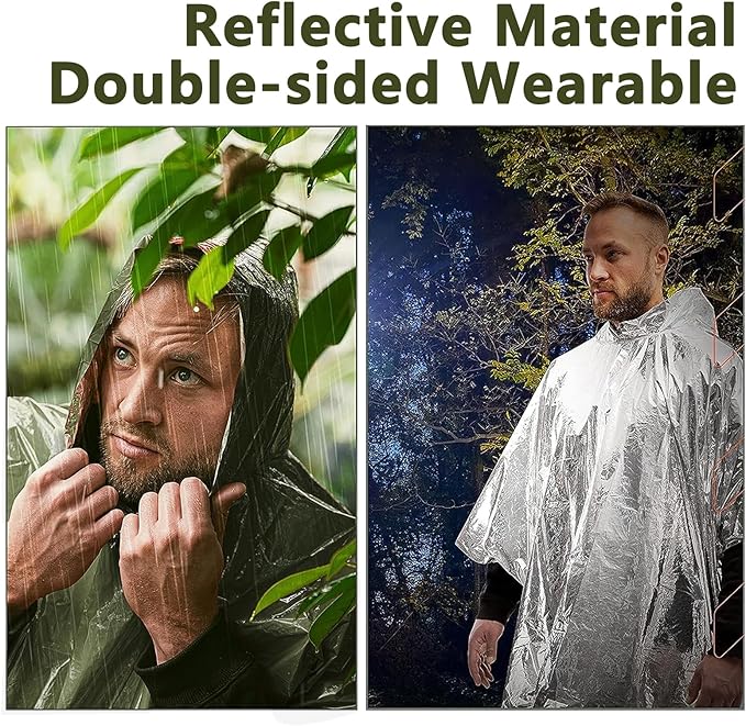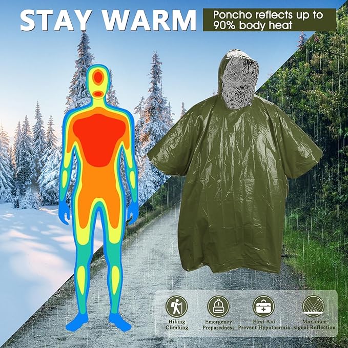 - Warmth and Protection: BiSiViO Emergency Rain Poncho keeps you warm in cold weather and provides emergency rain and wind protection. The 28µm thick thermal rain coat can serve as an emergency blanket, which will retain 90% of your body heat to help prevent hypothermia, and is waterproof and windproof.