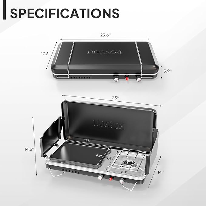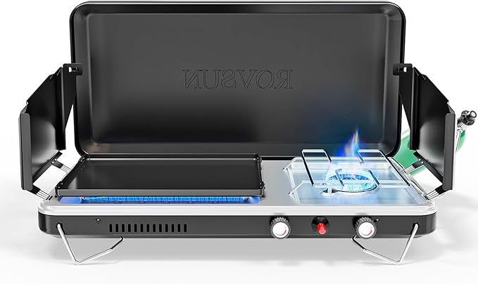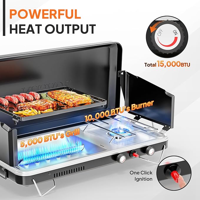 - 【2-IN-1 DESIGN】The combination design of the stove and griddle allows you to make delicious French toast, frying meat, grilled shrimp, grilling hot dogs, sandwiches, Mexican tortillas, etc. The high-quality griddle can quickly heat up through automatic ignition and provide precise temperature control through the knob