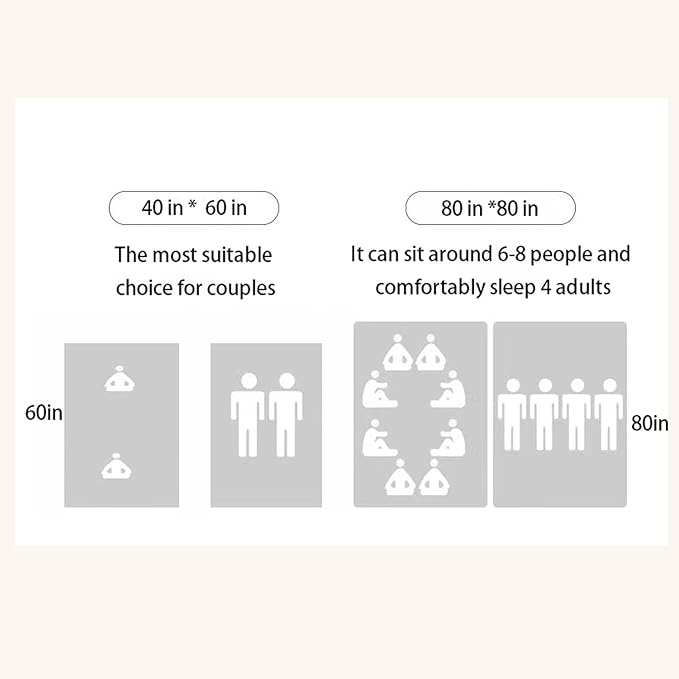- [Easy to carry and compact design] : Oversized picnic MATS are available in two sizes. The 80 "x 80" size can accommodate 4-6 adults. The 60 "x 40" size can accommodate 1-2 adults. The picnic mat can be folded into a lightweight and small handbag with a handle, which is easy to carry and comes with Velcro, which can be easily rolled out by tearing it
