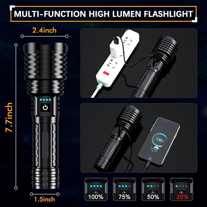 - 🌟Super Bright Flashlight High Lumens🌟Our upgraded Ultra Bright LED Flashlight utilizes the latest XHP-Ultra LED technology to deliver an astounding 2000,000 lumens–that's like turning on a sun! Whether you need to light up a room as big as 8000 square feet or want to focus on stuff way out there, up to 8000 feet away, this super bright flashlight has got you covered.