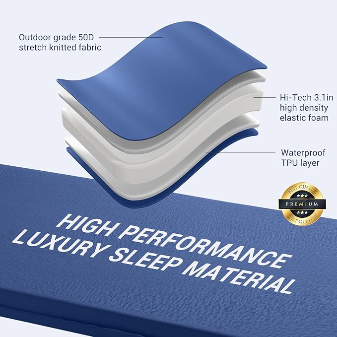 - Hi-Tech Memory Foam Sleeping Pad: Elegear self inflating sleeping pad features Hi-Tech memory foam with a density of 26D while other camping pads only have a density of 19D. Hi-Tech foam with high resilience can greatly distribute weight evenly and relieve body pressure at the different contact points of the camping mattress pad, create incredible softness and support. The elaborate Hi-Tech foam is only for you to experience the ultimate comfortable sleep and enjoy five-star hotel-level comfort.