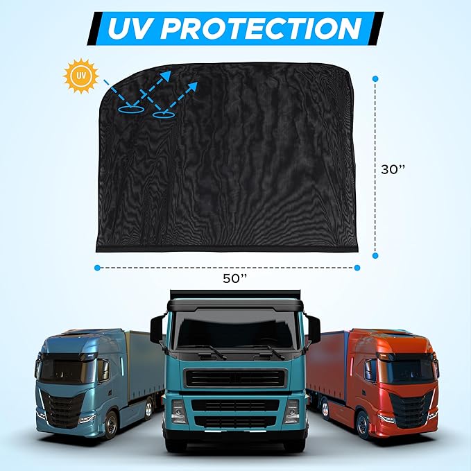 - TRUCK WINDOW SUN SHADE: Our Window Shade protect against sunburn, UV rays, heat and ensures privacy while driving on sunny days. It significantly reduces cabin heat, preventing truck interiors with large windows from overheating. The mesh screen keeps the vehicle cooler, minimizing the need for air conditioning.
