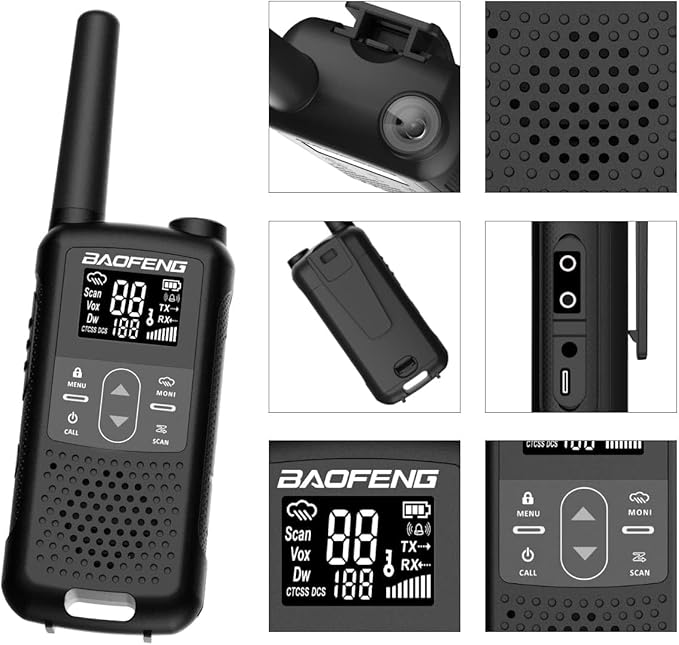 - [Features] With light night lighting, portable frs two-way radio with weather alarm for your outdoor trip, VOX hands-free feature and HD audio quality, as well as keyboard lock, backlit LCD display, low battery sound reminder, Type-CUSB interface for charging.