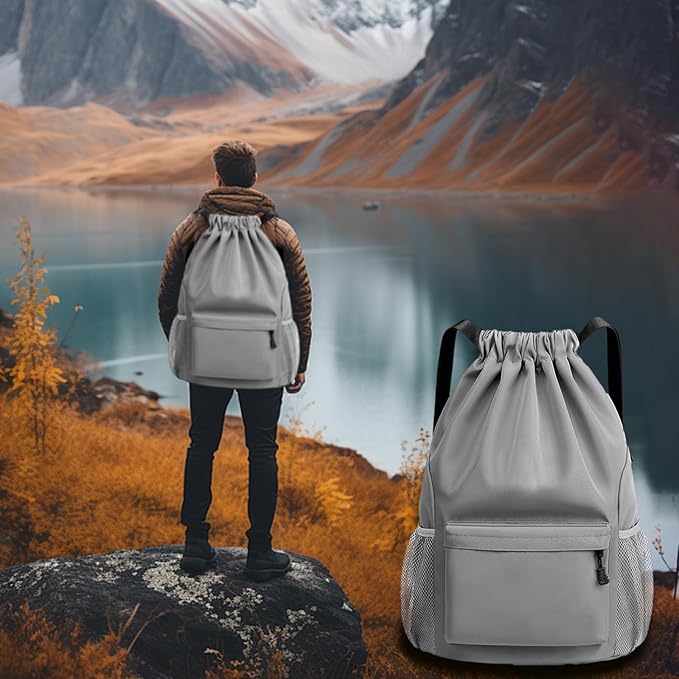 Sports Drawstring Backpack String Swimming Gym Bag Backpack with Shoes Compartment and Pocket for Men Women (grey)