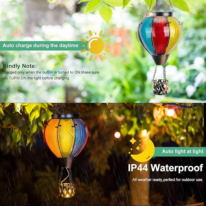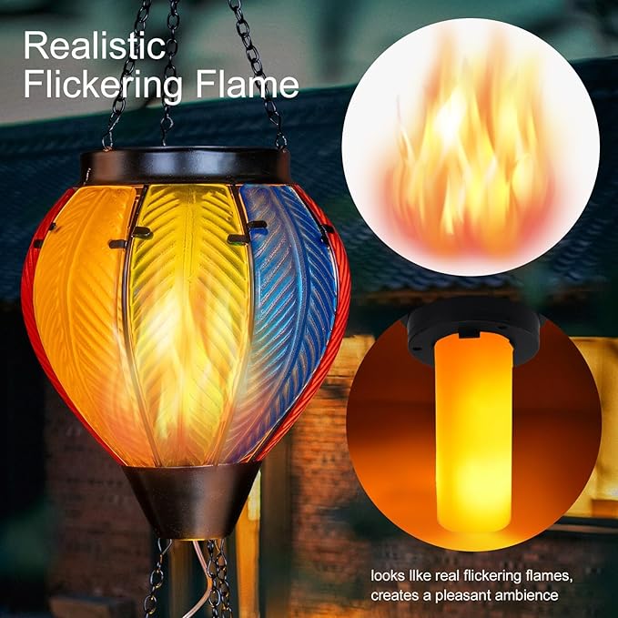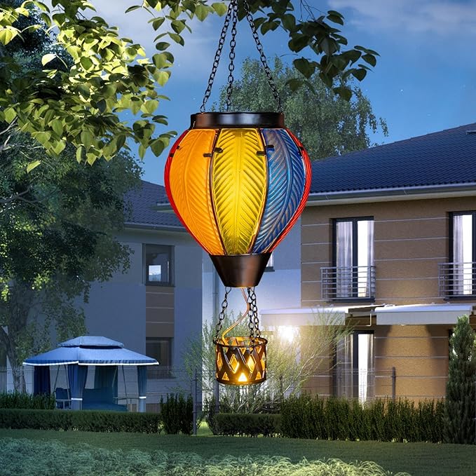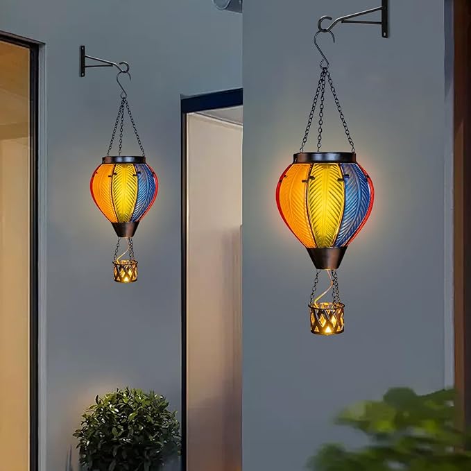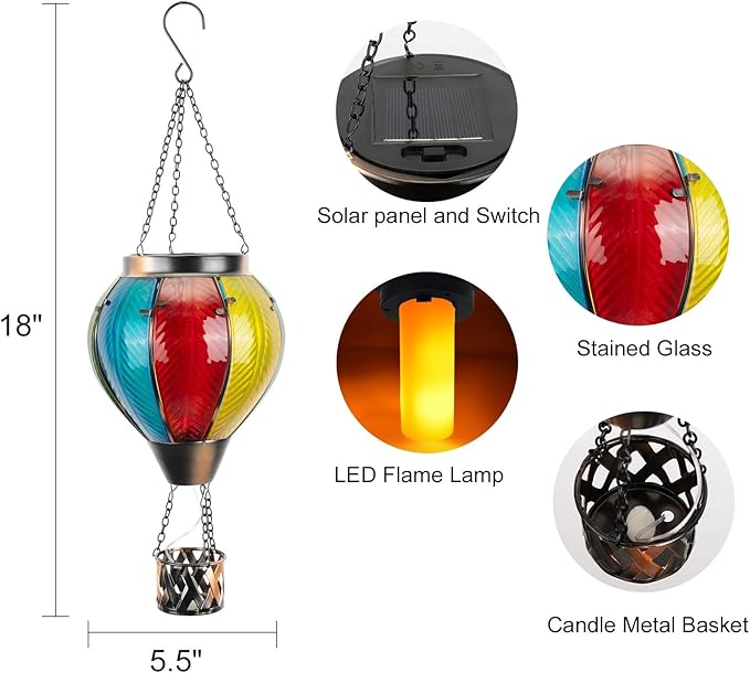 - Hot Air Balloon Decorations:The glass hot air balloons solar lantern is red, yellow, blue and green with leaf pattern.When the sun goes down, the flickering flame, the bright colors and unique design make your outdoor space is full of romance atmosphere.