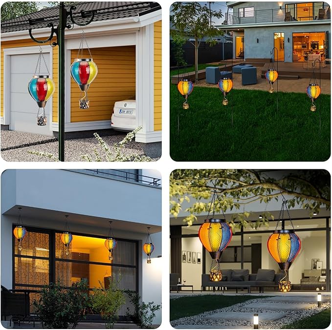 - Wide Application:Solar hot air balloon hanging garden light with metal "S" hooks can be easily hung anywhere, such as balconies,porches,ledges or trees.adding a cozy and romantic atmosphere to your home at night.