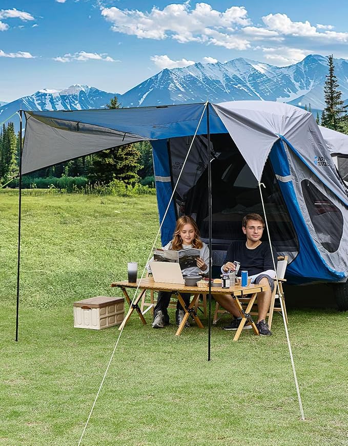 JOYTUTUS SUV Tailgate Tent with Three Sides Awning and Poles, Water Resistant SUV Camping Tent with Car Roof Cover, Outdoor Travel Preferred, Universal Fit Most SUV, Car, Blue