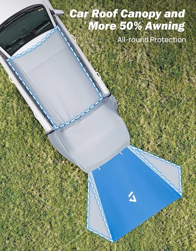 - 【Car Roof Cover】: Add a waterproof canopy on the front roof (full coverage of the roof to the front windshield) + Expandable Awning + Breathable Mesh: To protect privacy, and you can sleep in peace in the car. The awning can accommodate a table and chairs for 4-6 people to relax with a meal and a drink. It can also be turned off for privacy