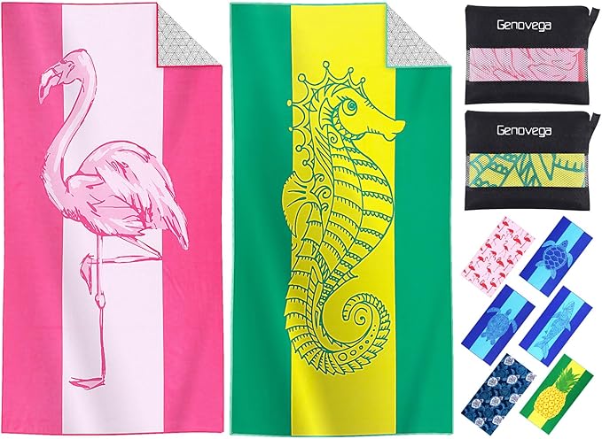 2 Packs Microfiber Oversized Lightweight Thin Beach Towel Compact Sandproof Quick Dry Clearance Towels Extra Large Sand Free Pool Travel Essentials Accessories Women Men Adults Gifts Seahorse Flamingo