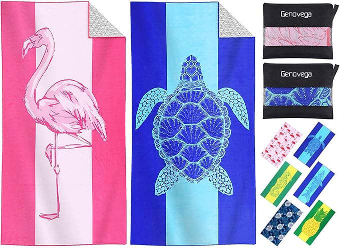 2 Packs Microfiber Oversized Lightweight Thin Beach Towel Compact Sandproof Quick Dry Clearance Towels Extra Large Sand Free Pool Essentials Accessories Women Men Adults Gifts Blue Turtle Flamingo
