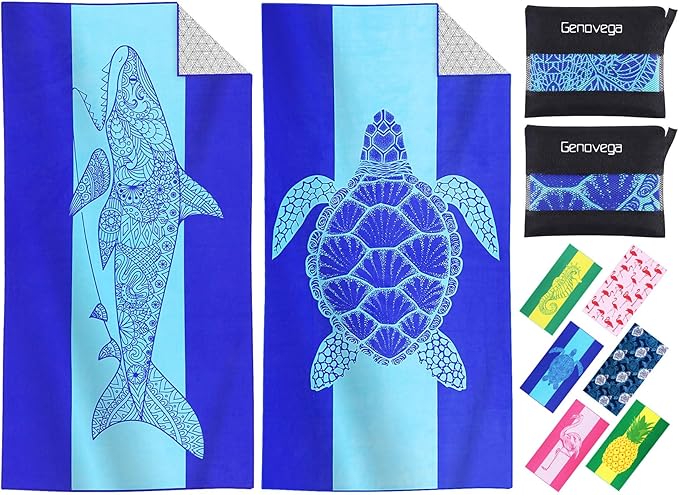 2 Packs Microfiber Oversized Lightweight Thin Beach Towel Compact Sandproof Quick Dry Clearance Towels Extra Large Sand Free Pool Travel Essentials Accessories Women Men Adults Gifts Blue Shark Turtle