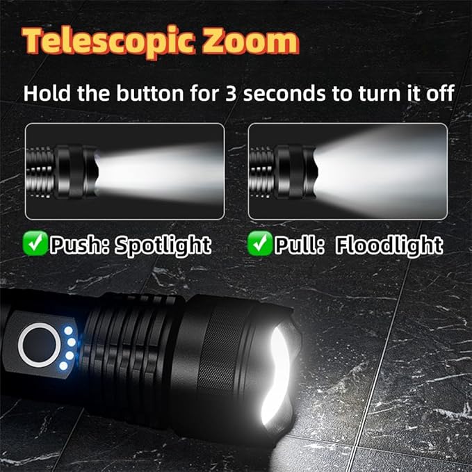 - 2. 5 Modes and Adjustable Focus: This handheld flashlights offers five modes: high, medium, low, strobe, and SOS. Hold the button for 3 seconds to turn it off. Adjustable zoom allows use as a floodlight or spotlight, meeting various lighting needs.