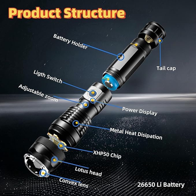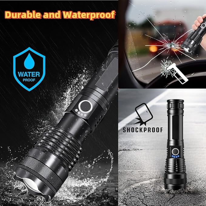 - 3. Durable Material and Long Battery Life: With an IPX4 waterproof rating, this bright flashlight is suitable for outdoor use and harsh weather. Made of aluminum alloy, it’s shockproof and wear-resistant. The 3000mAh battery of led flashlight rechargeable lasts 5-8 hours in normal use.