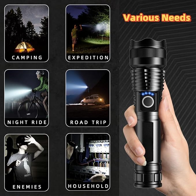 - 1. High Lumen LED Flashlight: Jumpso rechargeable flashlights features the latest ultra-bright LED chip, providing up to 5000 lumens high lumen and illuminating up to 1000 square feet long range. Ideal for night walks, camping, hiking, and emergencies.